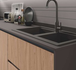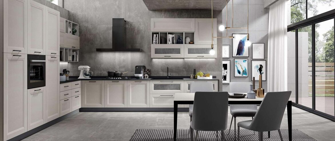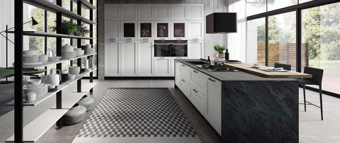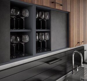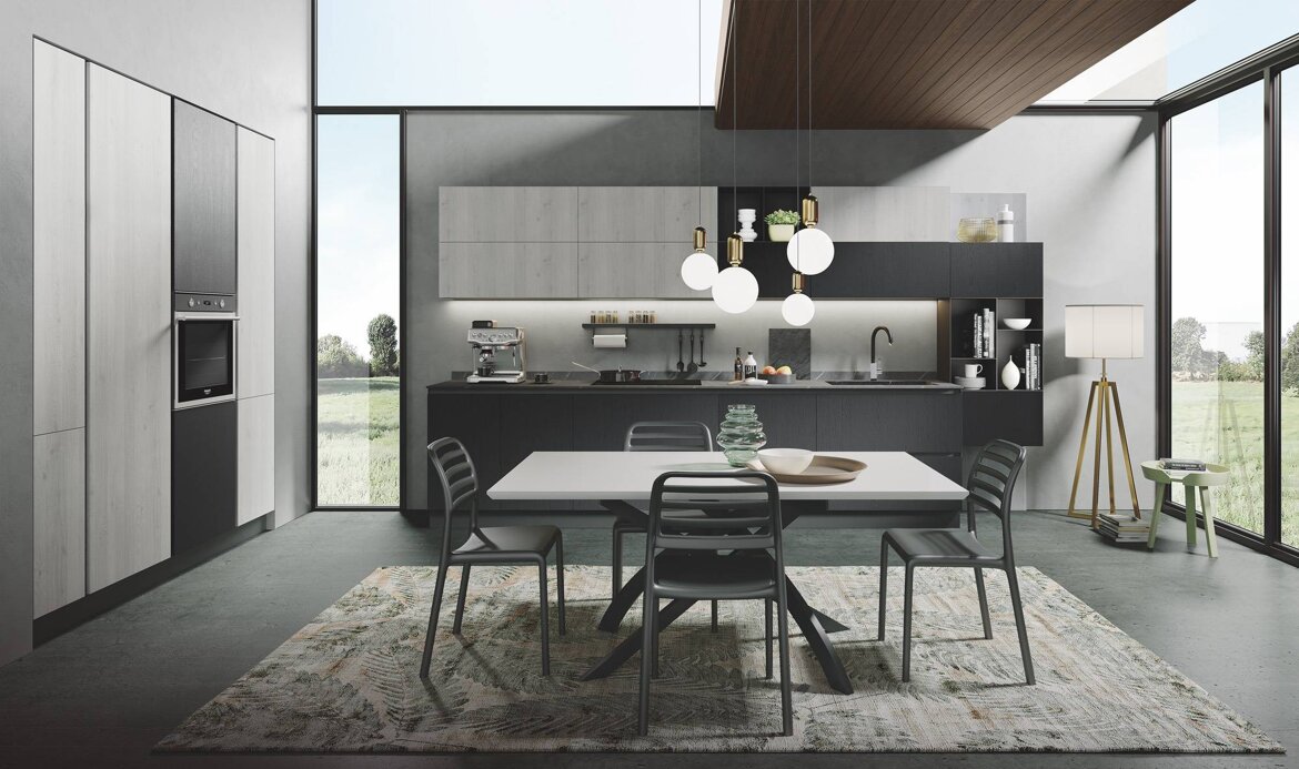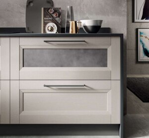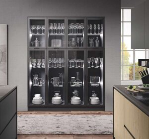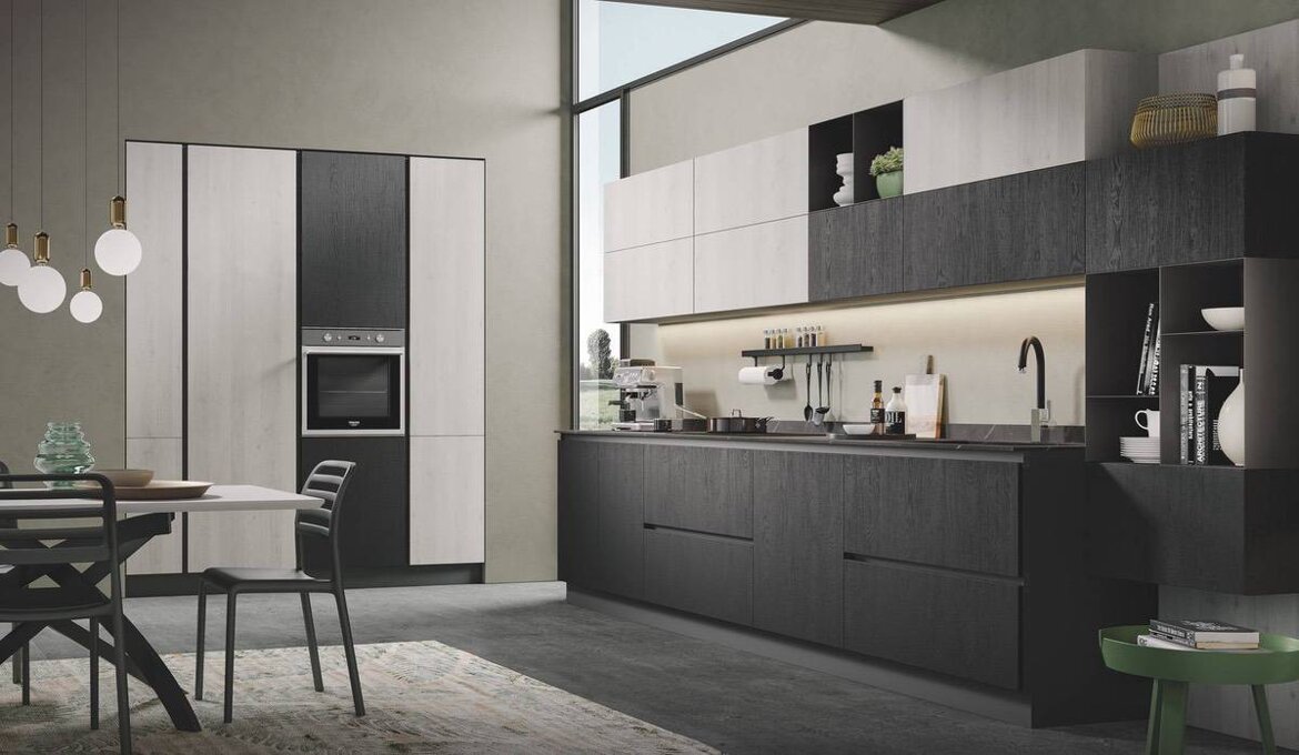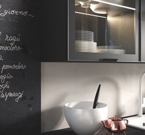 New Ego è caratterizzata dall’anta a telaio classica rivisitata in chiave moderna, le maniglie diventano dettagli di luce in nero soft touch dall’appeal nuovo ed accattivante.