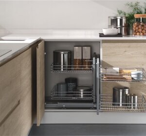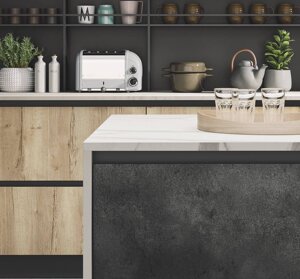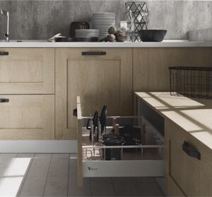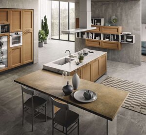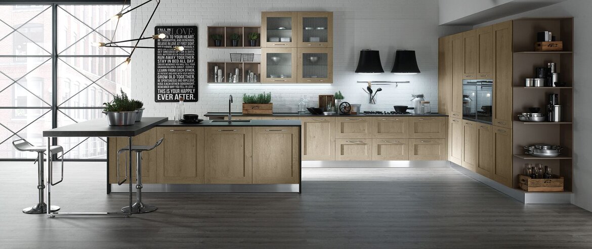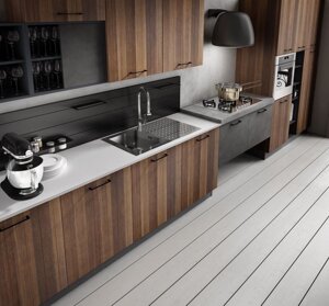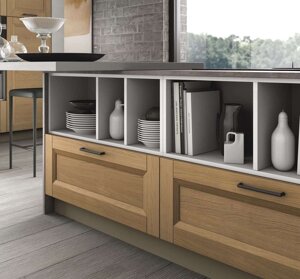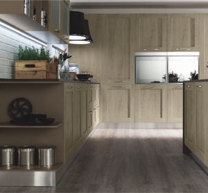 Non manca certo di forza, la cucina Nala caratterizzata da un’anta robusta, impiallacciata in legno di rovere su ben due lati.