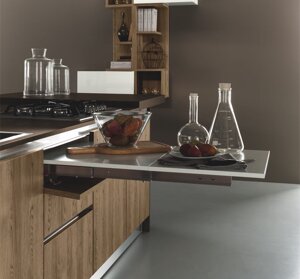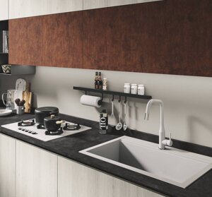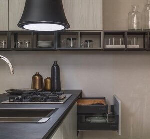 Dimensione urban. Nel qui ed ora, Mobilturi trae ispirazione dai materiali e dai colori metropolitani e propone con Zen atmosfere rilassanti. Look deciso. Materiali diversi come l’alluminio, il vetro e il laminato, si fondono in un’alternanza di sofisticati chiaro-scuri per una cucina dall’alta valenza tecnica ed estetica.Il programma di Zen si compone anche delle ante grigliate col telaio in alluminio anodizzato nel colore nero. I cestoni funzionali, diventano eleganti all’apertura se muniti di spondine laterali in vetro, disponibili su richiesta.