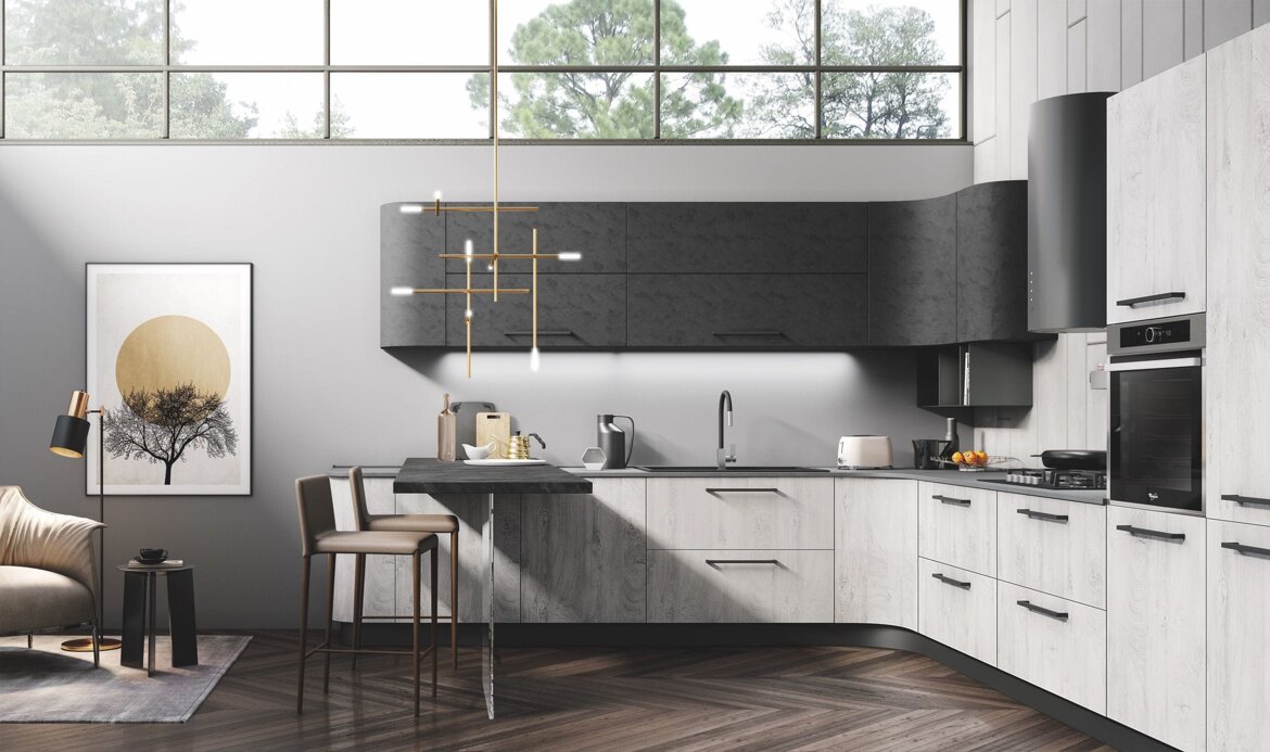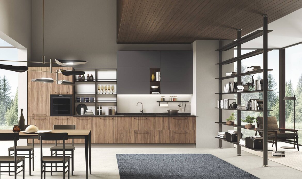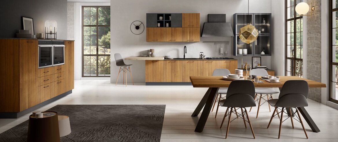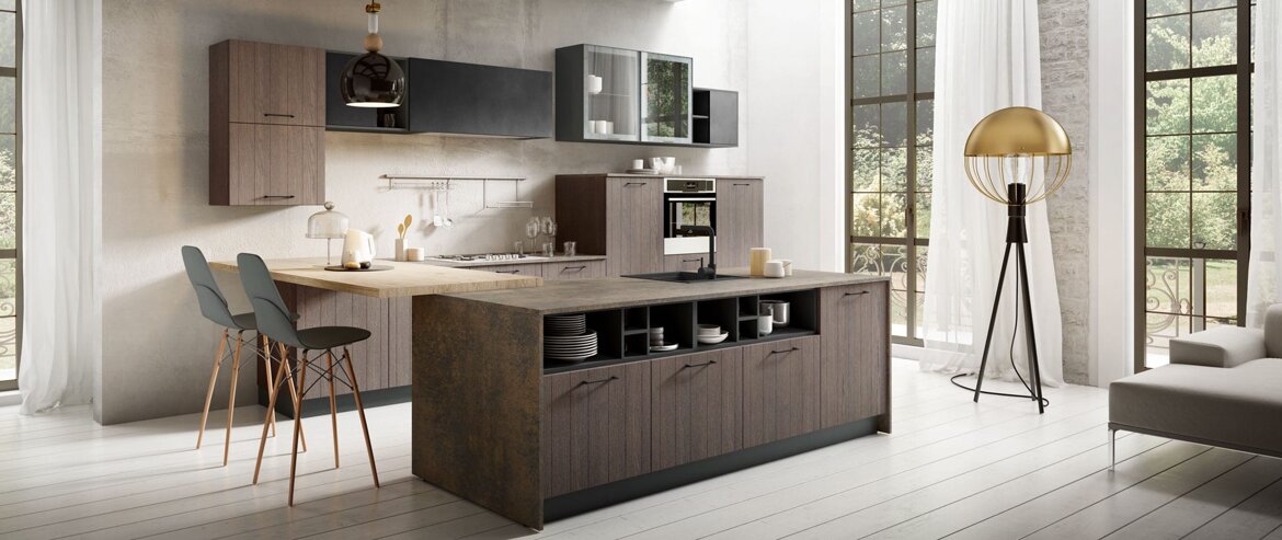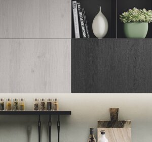 Le essenze materiche del rovere e dell’olmo si mescolano alle finiture lucide e opache.