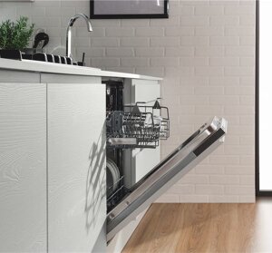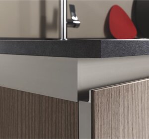 All’apertura, si svela l’elegante profilo dell’anta con la maniglia integrata a “L” sul bordo superiore.